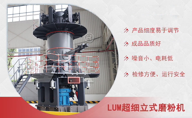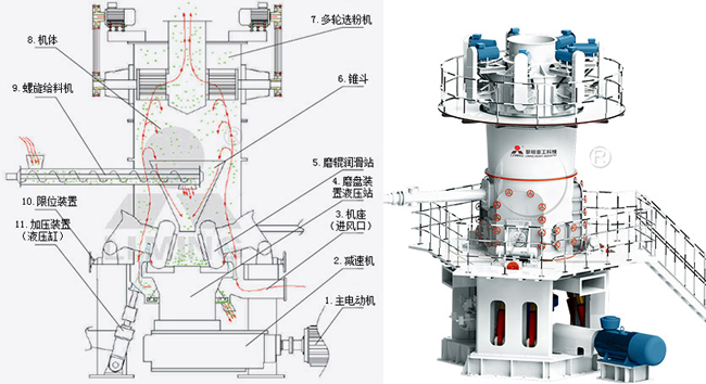 LUM超細(xì)立磨主電機(jī)通過(guò)減速機(jī)帶動(dòng)磨盤(pán)轉(zhuǎn)動(dòng),同時(shí)風(fēng)從進(jìn)風(fēng)口進(jìn)入磨機(jī),物料經(jīng)螺旋給料機(jī)下料口落在磨盤(pán)中央,在離心力的作用下,物料從磨盤(pán)中央向邊緣均勻移動(dòng),經(jīng)過(guò)磨盤(pán)上的粉磨輥道區(qū)域時(shí),受到磨輥的碾壓,大塊物料直接被壓碎,細(xì)粒物料受擠壓后形成料床進(jìn)行粒間粉碎。被粉碎的物料繼續(xù)向磨盤(pán)邊緣移動(dòng),直到被風(fēng)環(huán)處的強(qiáng)氣流帶走,而較大的顆粒物料又重新掉落到磨盤(pán)上繼續(xù)粉碎,氣流中的物料經(jīng)過(guò)上部的分離器時(shí),在轉(zhuǎn)子葉片的作用下,粗顆粒重新回到磨盤(pán)上粉磨,合格的細(xì)粉隨氣流一起出磨,被系統(tǒng)的集粉器收集,被收集到的粉料即為超細(xì)立磨磨出的產(chǎn)品。